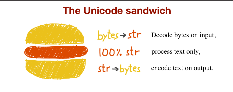 이는 입력할 때 가능하면 빨리 bytes를 str로 변환해야 한다는 것을 의미한다. 샌드위치에 들어가는 고기는 프로그램의 비즈니스 논리에 해당하는 부분이며, 여기서는 텍스트를 오로지 str 객체로 다룬다. 출력할 때는 가능한 한 늦게 str을 bytes로 인코딩한다.