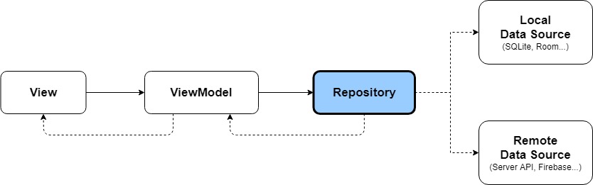 Repository Pattern? Repository(리포지토리) 패턴은 디자인 패턴 중 하나로, 데이터가 있는 여러 저장소(Local, Remote)를 추상화하여 중앙 집중처리 방식을 구성하고, 데이터를 사용하는 로직을 분리시키기